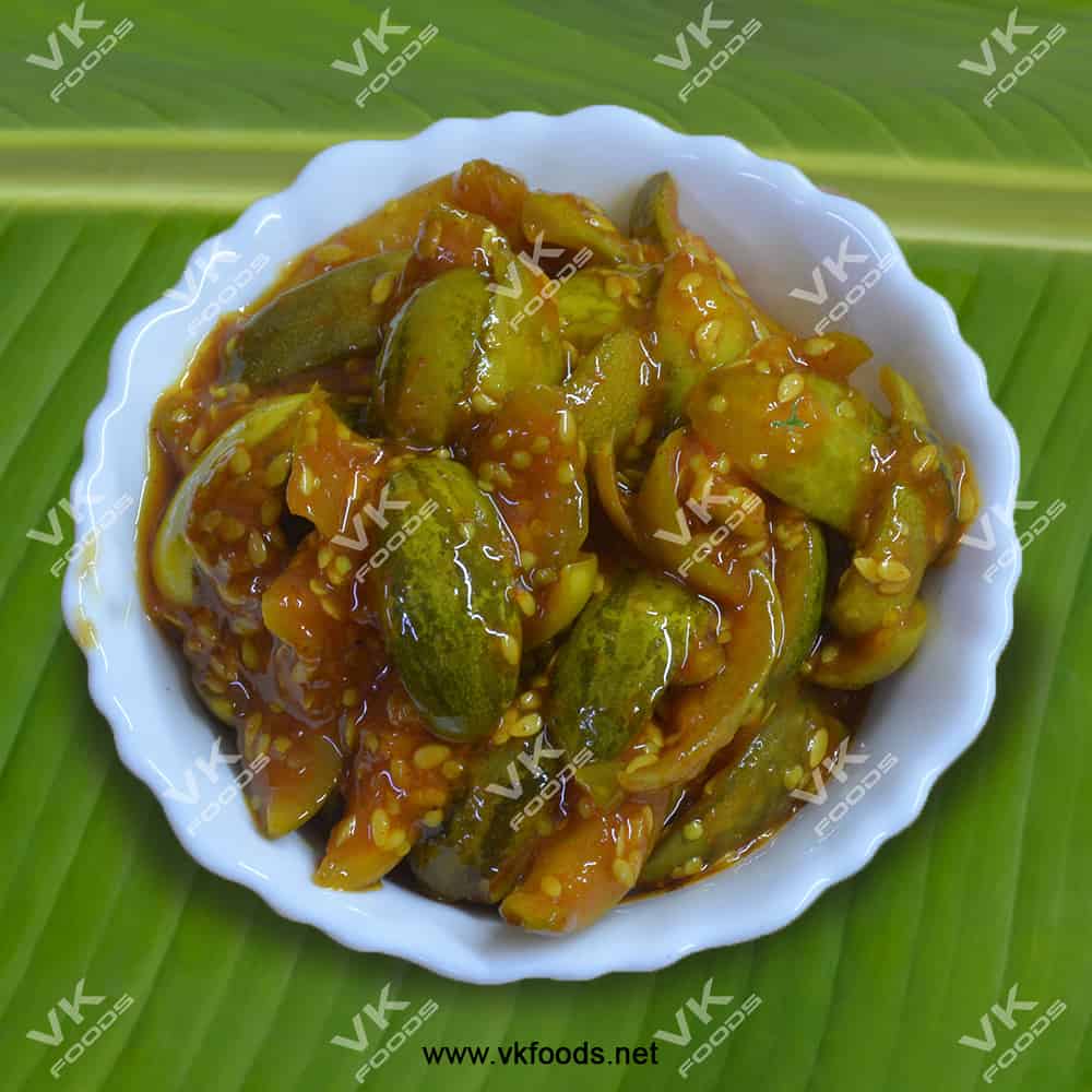 A tangy, spicy, and bold pickle made from mekkekai (tender cucumber) with traditional spices for a deliciously zesty flavor.